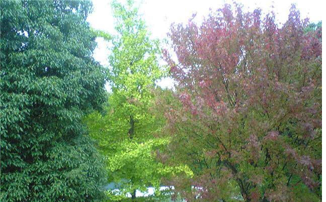 信号のように見えました。アラカシ?、イチョウ、トウカエデの紅葉の様子です。アラカシは常緑樹ですので目立ちます。