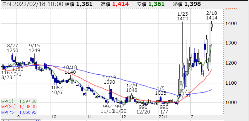 地政学リスクと言えば!防衛というわけで昨日引け前に1291円で2000株ほど購入しましたが…見事に吹いて1400円近辺で売却しました!!