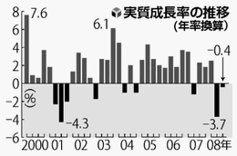 内閣府が17日発表した7-9月期の国内総生産(GDP)の速報値は、物価変動の影響を除いた実質で前期比0.1%減、年率換算で0.4%減となった。約7年ぶりに2四半期連続のマイナス成長を記録した。世界的な金融危機と景気低迷を受けて企業の設備投資が減少し、輸出や個人消費も伸び悩んだ。 記者会見した与謝野経済財政相は、「景気が後退局面にあることを示している」と述べ、02年からの景気回復期が終了し、すでに後退期に入っていることを認めた。2四半期連続の実質マイナス成長は、前回の景気後退局面下にあった01年以来。当時は4-6月期から3四半期続けてマイナス成長となった。