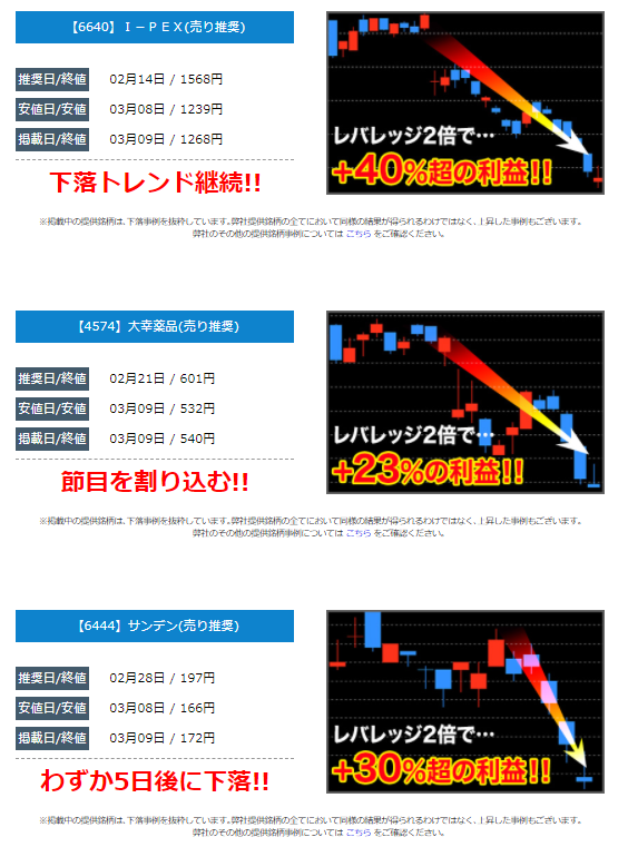 相場の流れを読んでるからこそ!急騰期待の銘柄だけでなく、上記のように相場の状況に合わせて“空売り推奨”銘柄も提供して、荒れ相場の中で個人投資家が利益を出せる情報を提供してくれるんですよね!