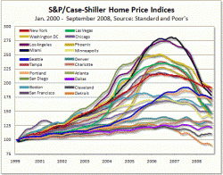 米格付け会社スタンダード・アンド・プアーズ(S&P)が25日発表した9月の「S&Pケース・シラー住宅価格指数」は全米20都市でみて前年同月に比べ17.4%下がった。前月比では1.8%低下した。10都市では前月比1.9%低下、前年同月比18.6%の大幅な下落率となった。下落幅はいずれも過去最大。 四半期ベースでも、住宅価格の下落ペースは加速した。08年第3四半期、住宅価格は年率で前年同期比16.6%低下。第2四半期は同15.1%、第1四半期は14.0%それぞれ低下した。 9月の主要10都市圏の価格動向を示す指数はピーク時から23.4%低下。主要20都市圏の住宅価格動向を示す指数も21.8%低下した。 同月に最も価格が下落したのはフェニックスで31.9%下落。次いでラスベガスが31.3%、サンフランシスコが29.5%、マイアミが28.4%、ロサンゼルスが27.6%、サンディエゴが26.3%それぞれ下落した。
