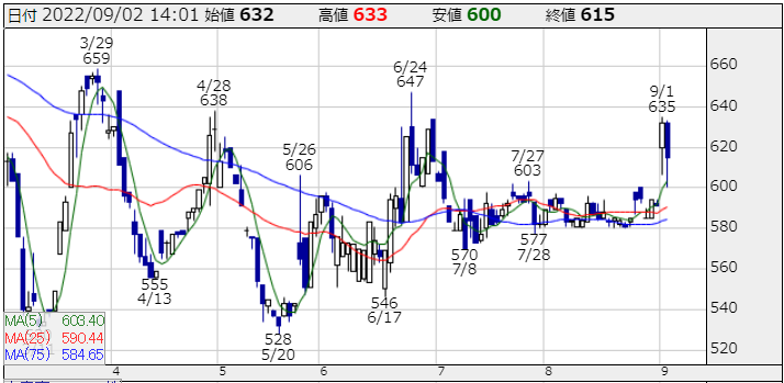 クシム社が提供する学習管理システム(「iStudy LMS」および「SLAP」システム)および人材育成サポートとしてのEラーニング事業をODKが譲り受け開発力とのシナジー効果に期待がかかる。低調だったシステム開発の中でも医療系が回復しマイナンバー法改正で関連業務や教育関連事業では受験ポータル採用校数が堅調増、補習等の周辺サービスの品ぞろえも拡充が収益に寄与し始めた。 同社は本日、自社株買いを発表。取得期間は22年9月1日-23年5月31日。取得株数上限で10万株(自己株式を除く発行済み株式総数の1.2%)取得理由を譲渡制限付株式報酬のための株式確保との事で資金が短期的に同銘柄に向いている状態が想定されるが、ハッキリ言って地合い悪の1日です。週末の雇用統計の結果が強気の見方が多く、即ち利上げペースの上昇が想定されるので株価が下がるという視点でポジション調整週になってしまっているので、物色意欲が小さいのは仕方ないが、もっと物色されても良い材料なだけに短期的にはもう一段上振れが期待される。
