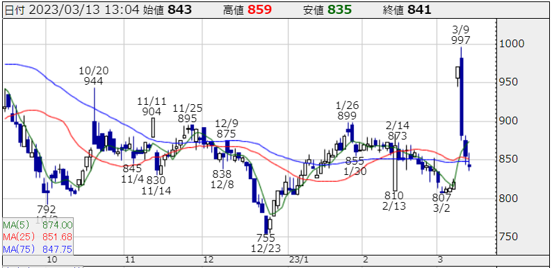 自動車部品は後半に顧客の生産減が解消し持ち直す。空調部品はASEAN向けに伸びる。焼成炉を増設、23年度完成後はサーミスタ素体生産量1・5倍に。電動車モーター向け部品は23年度量産納入開始。2月10日大引け後(15:00)の決算発表では通期の同利益を従来予想の6億4000万円→4億4500万円(前期は5億3600万円)に30.5%下方修正したことから株価も1月の上昇トレンドが一転調整局面になった。今月8日に公開された特許公報によると、デンソーと共同で「電池モジュール」に関する特許の登録があったことに投資家の関心が集まり、これが一時ストップ高を誘う要因となった。今後は調整局面からの反転を狙っているが、かなり荒っぽい株価の動きになる模様なので投資経験のある方におすすめです。