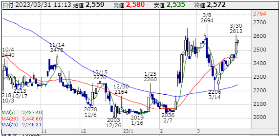 顧客のDX化需要強いうえ、エンジニア積極採用などによる供給力アップも効く。主柱のDX支援コンサルが好調。自律走行ロボ開発などのシリウスジャパン(東京・江東)と提携で基本合意、12月正式契約目指す。10-12月期(4Q)の連結経常利益は前年同期比3.3倍の9800万円に急拡大し、売上営業利益率は前年同期の5.9%→14.1%に急改善し、5期連続で過去最高益を更新する見通しとなった。先月の底値から業績の改善と政府のDX政策の発表などを受け上昇トレンド入りしている。調整局面からの転向なのでかなり荒っぽい株価の動きになるので投資経験のある方向け銘柄です。