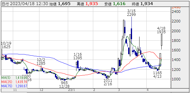 24年3月期は限定ノベルティなど販促積極化で漫画販売が向上。イベントも人気IPとのコラボ増やして伸長。東京証券取引所が、信用取引による新規の売り付け及び買い付けに係る委託保証金率を50%以上(うち現金20%以上)とする信用取引の臨時措置を3月24日売買分から解除すると発表し材料視されたがコロナ禍の巣ごもり消費による特需一服が伝わると調整局面に入っていたが、今回コロナ渦の制限解除や中国を中心とする海外で映画化された『スラムダンク』が中国だけで前売り券で8億円売り上げの情報が伝わると株価も上昇トレンド入りしている。後場にはSTOP高で取引を終えているが今後とも『スラムダンク』特需の恩恵がありそうです。調整局面からの反転であり今後ともかなり荒っぽい株価の動きとなると予想され投資経験のある方におすすめの銘柄となります。