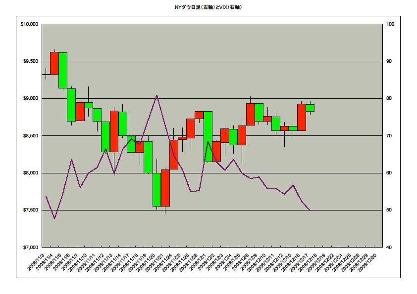 12/17のVIX(恐怖指数)は11/4(47.73)以来約1ヶ月半ぶりに50を割り込んだ。この指数はご存知のとおり低くなるほど市場にとってポジティブ材料になります。