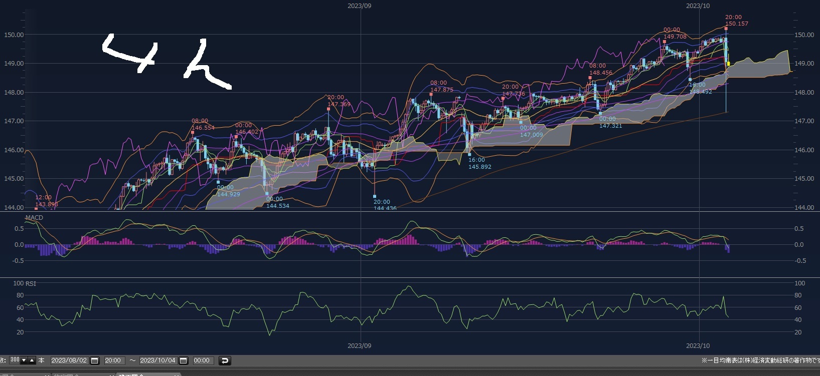 2023/10/04 - じょーじわしんとんさんの株式ブログ。タイトル:「被弾!!!」 本文:月初からやらかしたぜ高値ブレイクで信じて付いて行ったら振り落とされた!しかもぽじった後に何も見ずに風呂入ってたから質が悪いw見てたら対処なんぼでも出来とったはずやのにな~。何なら押し