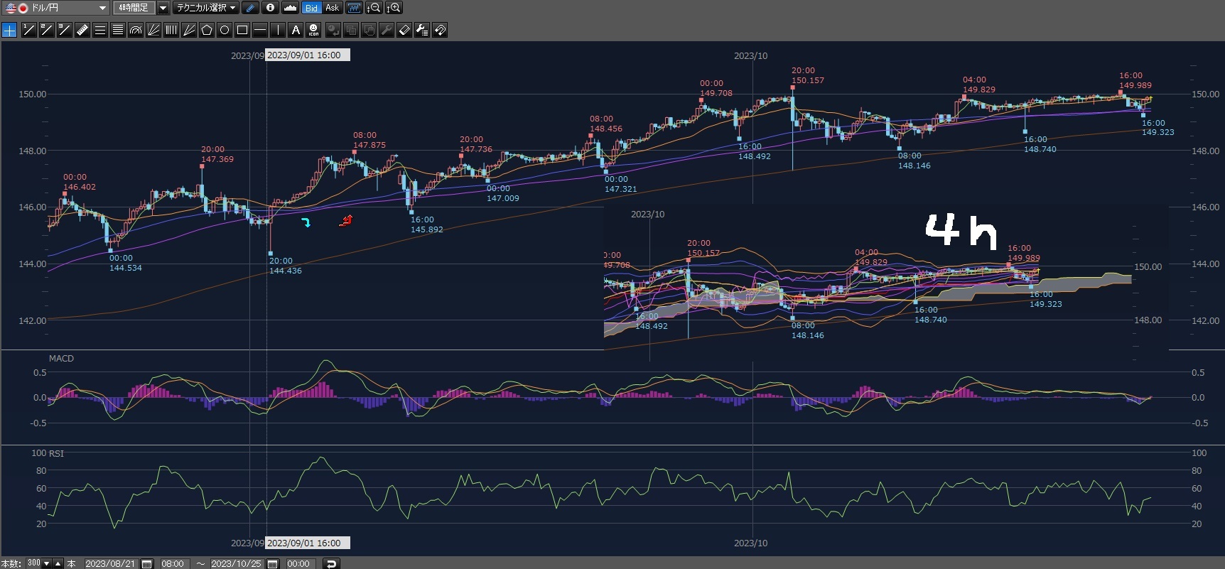 2023/10/25 - じょーじわしんとんさんの株式ブログ。タイトル:「やられたな~」 本文:出先で見たらばり下がってて、これホンマの下げちゃうんと思って利益ある内に利確した。けど失敗やったな・・・普通にWボトムで反発してるわ最大40万超えの含み益やったんが8万の利確で終わっ