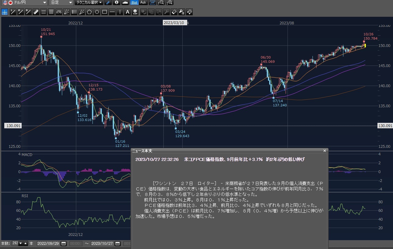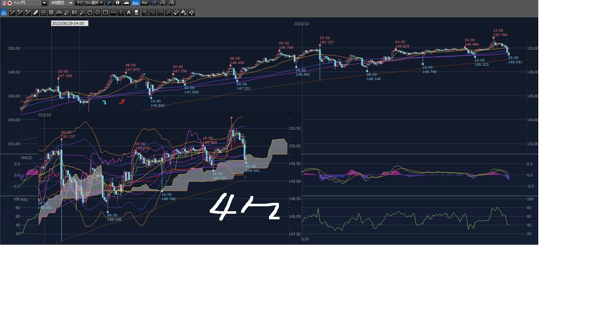 2023/10/28 - じょーじわしんとんさんの株式ブログ。タイトル:「久々の指標トレード」 本文:猛ダッシュして帰ってきたらまだ相場はそない動いてない。チャートをチェックしてS一旦上がったけど、下がって来てくれた。ほぼほぼドン底で利確続きまして反転狙いでエントリーそのまま反発して行ったけどジリジリ