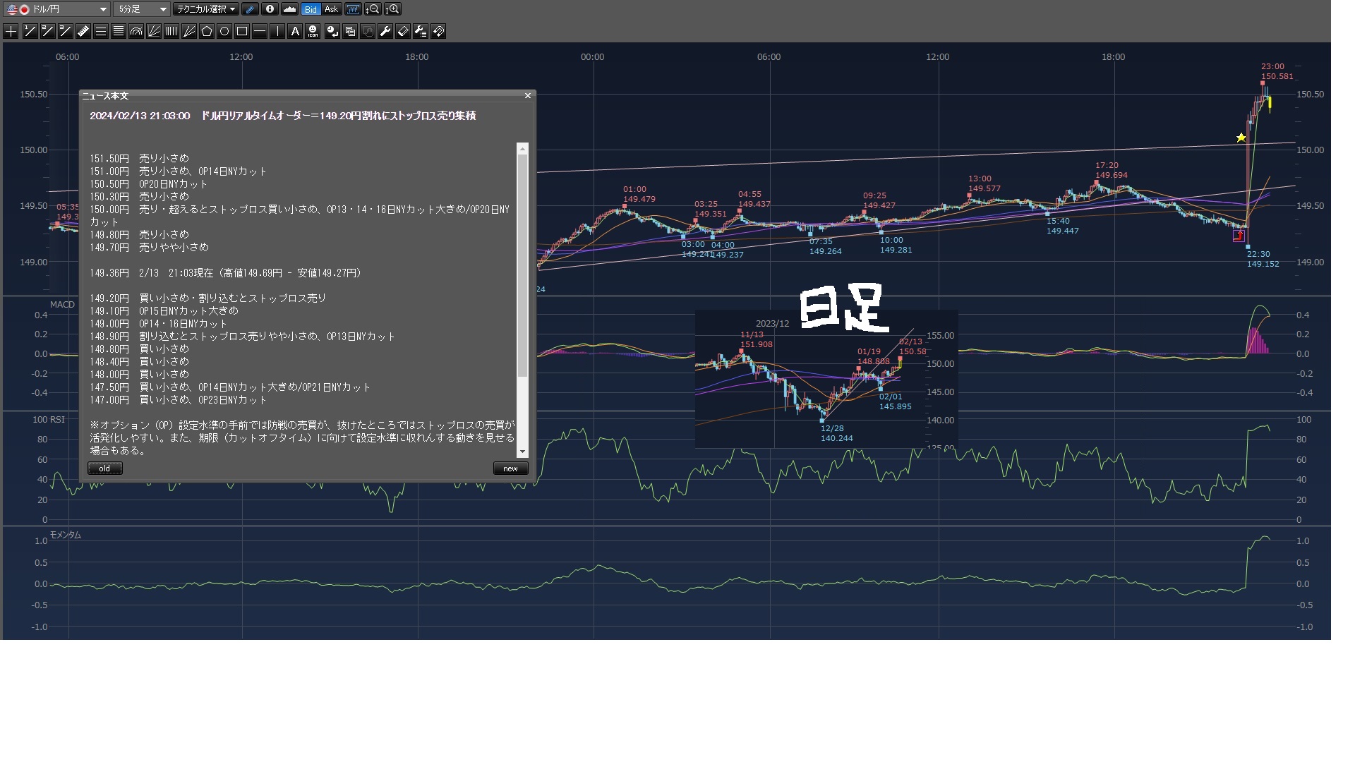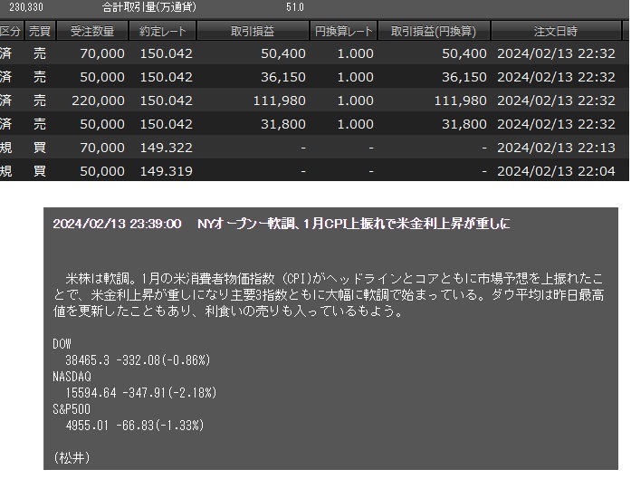 2024/02/14 - じょーじわしんとんさんの株式ブログ。タイトル:「久々に来たよ~♪」 本文:爆上げ!CPIに乗っかって23万の儲け持ち越し分とどうせ上がるやろで直前に買った分で、上手い事行きました。今月はあんまやってない割に大きな損切があ