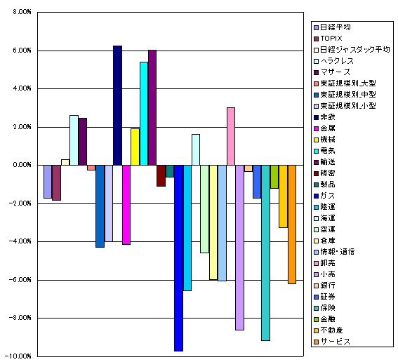 2009/01/09 - tetsuさんの株式ブログ。タイトル:「【データ】年初からの指数・業種別別騰落率」 本文:1月5日初値と本日9日の終値で騰落率を 出してみました。 日経平均 -1.72% TOPIX -1.84% 日経ジャスダック平均 0.29% ヘラクレス 2.61% マザーズ