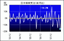 内閣府が15日発表した2008年11月の機械受注統計によると、設備投資の先行指標となる「船舶・電力を除く民需」(季節調整値)は7542億円と、前月に比べ16.2%減った。2カ月連続の減少で、マイナス幅は比較可能な1987年4月以降で最大。製造業の受注が過去最大の落ち込みとなったのが響いた。世界的な景気後退の影響で輸出産業を中心に減産を加速、設備投資の抑制も急ピッチで進んだとみられる。 内閣府は基調判断を3カ月ぶりに下方修正し、前月までの「減少している」から「大幅に減少している」とした。「世界景気の落ち込みが波及し、国内の設備投資は今後も弱含む」とみている。