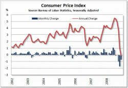 米労働省が16日発表した2008年12月の消費者物価指数(1982-84年の平均値=100)は210.228となり、前年同月比(季節調整前)で0.1%上昇した。上昇率は朝鮮戦争後の国防費削減で景気が悪化した55年8月(0.4%下落)以来、約53年ぶりの低水準で、デフレ懸念がぬぐい去れない情勢だ。 季節調整済みの前月比では0.7%の下落。下落率は過去最大だった前月(1.7%)よりは縮小したが、前月比マイナスは3カ月連続となった。 変動の大きいエネルギーと食品を除いたコア指数は季節調整済みで前月比横ばい。エネルギーは8.3%、食品は0.1%それぞれ下落した。 世界的な景気悪化を背景に原油価格が急落。金融危機による信用収縮が内需を下押ししており、米経済はデフレに陥る懸念が強まっている。