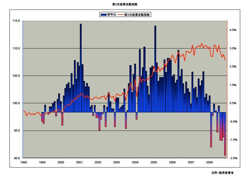 2009/01/20 - manmonomoneyさんの株式ブログ。タイトル:「第3次産業活動指数は過去最大の落ち込み!」 本文:11月第3次産業活動指数=経産相 107.9 前月比▲0.9% 予想 ▲0.8%
