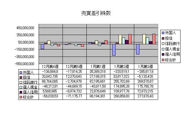 2009/01/30 - tetsuさんの株式ブログ。タイトル:「1月第3週投資主体別売買動向 」 本文:1月第3週投資主体別売買動向は外国人は2週連続の売り越し、投信は買いから売りに転じた。 信託銀行及び個人は引き続き買いが旺盛で、共に3週連続で買い越した。 この週は週間で573.01円下げた。