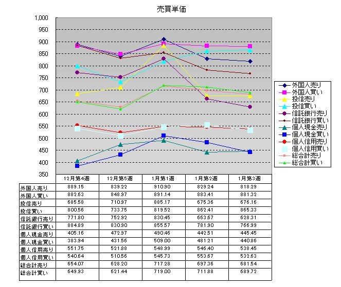 1月第3週投資主体別売買動向は外国人は2週連続の売り越し、投信は買いから売りに転じた。