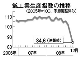 経済産業省が30日発表した2008年12月の鉱工業生産指数(速報値、2005年=100)は84.6となり、前月に比べて9.6%低下した。3カ月連続の低下で、マイナス幅は統計上比較可能な1953年2月以降で最大を更新。生産水準としては1987年9月以来の低さ。 12月の生産の前月比低下幅は市場予測平均(9.2%)をやや超えた。前年同月比は20.6%低下で、最大のマイナス幅。経産省は生産の基調判断を前月と同じ「急速に低下している」とした。四半期ベースで10-12月期は前期比11.9%低下で、4期連続の落ち込みとなった。08年(暦年)の生産は前年比3.4%低下で6年ぶりのマイナスとなった。