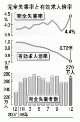 総務省が30日発表した2008年12月の完全失業率(季節調整値)は、4.4%と前月に比べて0.5ポイント悪化し、41年ぶり1967年3月と並ぶ過去最大の悪化幅となった。企業のリストラによる失業が急増。雇用削減の動きが非正規社員から正社員へと波及してきている。 完全失業率は15歳以上の働く意思のある人のうち、職に就いていない人の割合を示す指標。自己都合による求職が5万人増だったのに対し、企業の倒産などによる「勤め先都合の求職」が25万人増えた。 完全失業者は前年同月に比べて39万人増え、270万人となった。 厚生労働省が同日発表した12月の有効求人倍率(同)は0.72倍と前月を0.04ポイント下回った。有効求人倍率は公共職業安定所(ハローワーク)で職を求めている人一人あたりに何件の求人があるかを示す。12月は職探しをしている有効求職者数が3.8%増え、企業の求人数である有効求人が1.9%減った。同倍率が1倍割れした都道府県は東京、愛知、香川を除く44にのぼった。