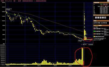 テクニカルでチャートを読む場合 もっとも重要なのは出来高です。 ↑のチャートを見てください。 下の丸は、出来高 右の丸は、価格別出来高 出来高が多いという事は その価格で売買した人が多いという意味です これは、8591 オリックスのチャートですが。 安値あたりで、ものすごい出来高が増えました。 このチャートから読み取れるのは ① オリックスの買い方は、もうだめだと思い 投売りした ② まだまだ下がると思い、新規の空売り(ヘッジ)を入れた。 ③ 大量の売りに対して、逆に買いまくった人がいる。 大きくわけて この3種類の人らの売買だと思います。 買いと売りは常に相場では同じ数なので 投売りが出た分 拾った人も多いという事です。 ③の大量の売りに対して、逆に買いまくった人がいる。 こんな事ができるのは、大口投資家、機関投資家しかできません。 しかもこういう人たちは、買ったら 利益がでるまでなかなか売りません。 長いスパンで勝負する 大口長期投資家といっていいでしょう。 ようするに安い所で出来高が増えて起こる 現象としてチャートの裏側を読み取ると ①②などの投資家が投売り、空売り入れて値下がりした所を ③などの機関投資家が 逆に買いに向かい、ごっそり拾う そうすると上の方でもっていた人たちが 投売りしたおかげで 戻り売り圧力が減り そこで株を買った分 浮動株(市場に出回る株が減り) 需給改善で ↑にあがる。 こんな仕組みです。 だから 出来高って大事なのです。 大口の売買は 出来高に必ず現れます。 今後 出来高を意識して、チャートを読んでみて下さい。 お役に立ったら、ランキングクリックお願いいたしますm( )m
