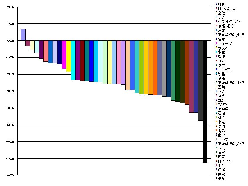 2009/03/02 - tetsuさんの株式ブログ。タイトル:「指数・業種別騰落ランキング」 本文:1.証券 0.69%(-0.19%) 2.日経JQ平均 -0.32%(0.55%) 3.金融 -0.56%(-2.96%) 4.空運 -0.72%(2.02%) 5.ヘラクレス指数