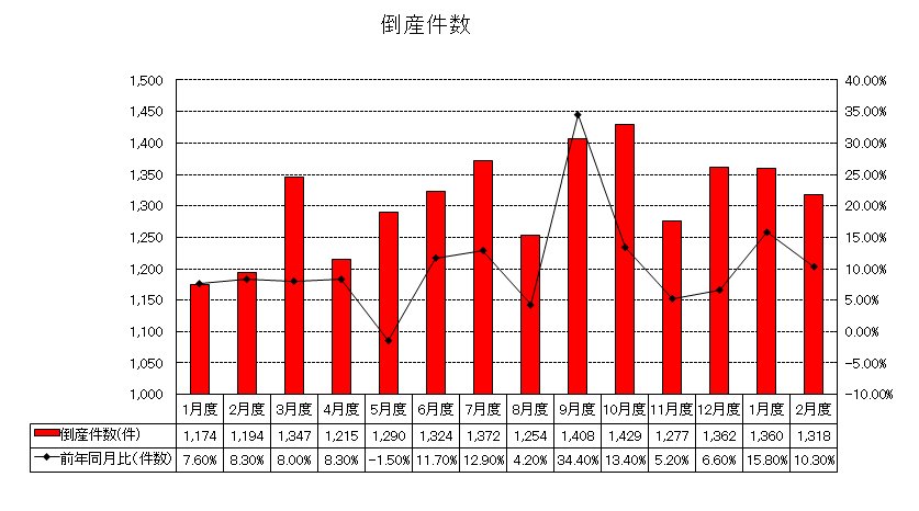 東京商工リサーチがまとめた「全国企業倒産状況」の2月度は、倒産件数が前年同月比で10.3%増の1,318件。