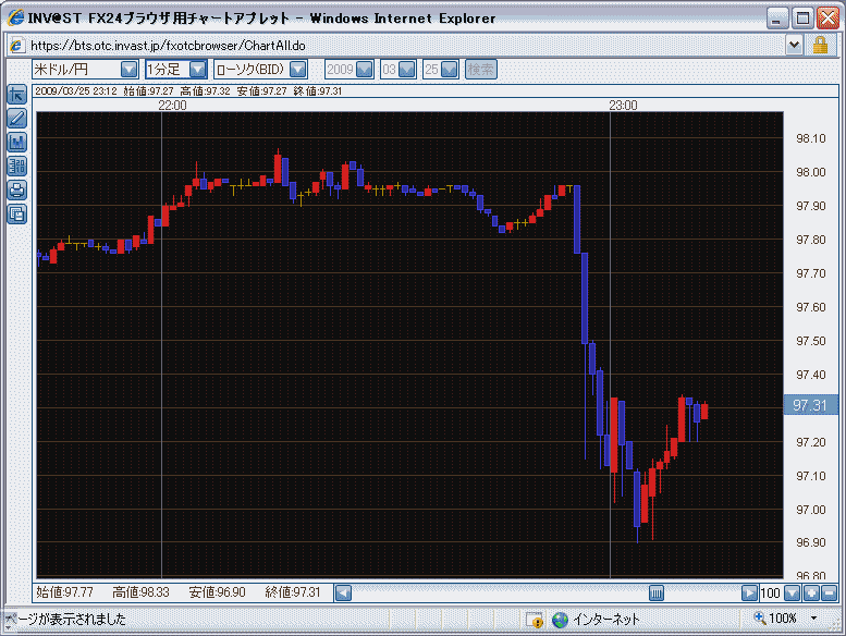 2009/03/25 - 夢幻さんの株式ブログ。タイトル:「怖い動きしてるな・・・」 本文:23:00前後にドルが急落。 オプションがらみの動きのようです。 5分で97.9台→96.9台と1円下落。 (同時間帯でユーロ/ドルは200pip弱のドル安、