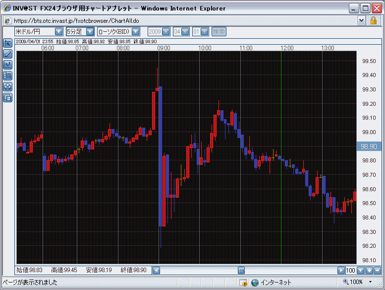 2009/04/02 - 夢幻さんの株式ブログ。タイトル:「為替動向ほか(2009/4/1)」 本文:新年度早々、荒れてます。 米ドル/円> 日銀短観発表直後の円売り(?)で200日移動平均線を突破!! と思いきや、すぐさま戻った上に5分で1円以上の下落。 さらに1時間で8割方戻し。