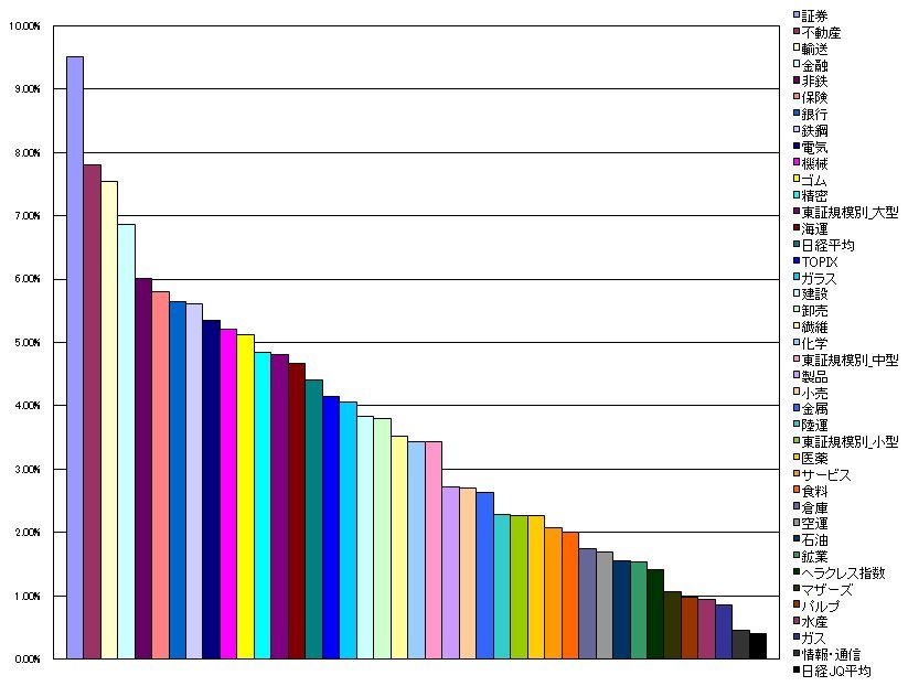 2009/04/02 - tetsuさんの株式ブログ。タイトル:「指数・業種別騰落ランキング」 本文:1.証券 9.50%(4.61%) 2.不動産 7.81%(4.95%) 3.輸送 7.54%(5.26%) 4.金融 6.87%(3.54%) 5.非鉄 6.01%(5.31%) 6.保険