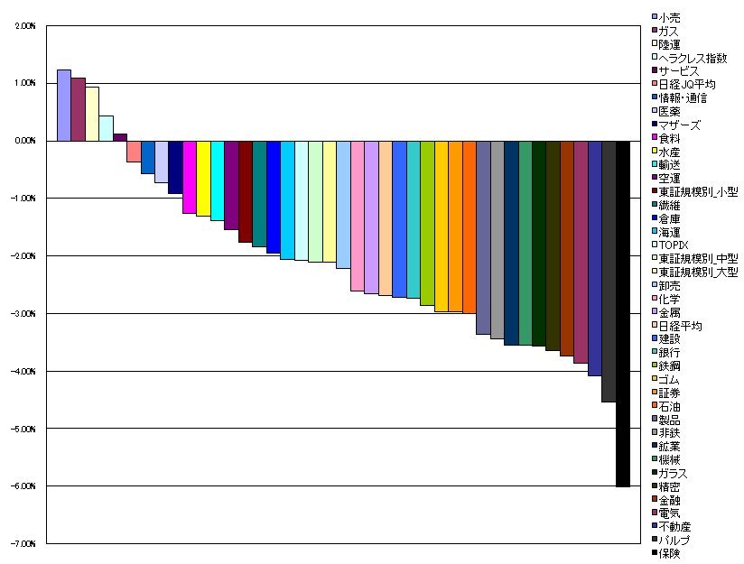 2009/04/08 - tetsuさんの株式ブログ。タイトル:「指数・業種別騰落ランキング」 本文:1.小売 1.23%(-0.05%) 2.ガス 1.09%(0.85%) 3.陸運 0.94%(2.49%) 4.ヘラクレス指数 0.43%(0.53%) 5.サービス