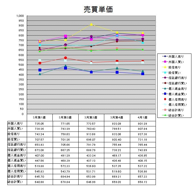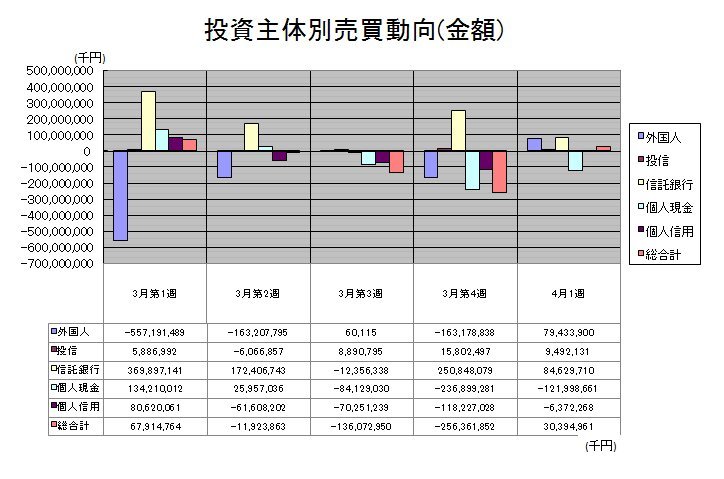 4月第1週の投資主体別売買動向は外国人と年金資金の売買窓口である信託銀行が買い越し。個人が売り越しとなった。