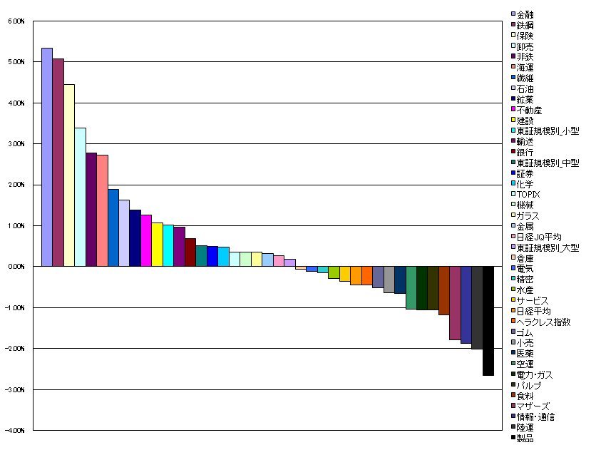 2009/04/13 - tetsuさんの株式ブログ。タイトル:「指数・業種別騰落ランキング」 本文:1.金融 5.34%(3.71%) 2.鉄鋼 5.08%(1.10%) 3.保険 4.45%(3.65%) 4.卸売 3.39%(1.18%) 5.非鉄 2.77%(1.50%) 6.海運
