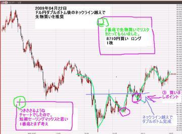 2009/04/22 - aaaいうえおさんの株式ブログ。タイトル:「ドル円のダブルボトム ネックライン超え」 本文:ドル円に関してですが、高い位置から下値のサポート位置まで急落いたしました、サポートをわれ、オーバーシュート後、安値戻りをためしましたので、底を一番底、次の下げを2番底、そこでダブルボトム形成の予想をた