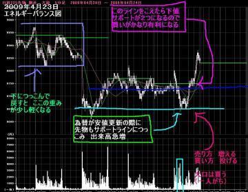 本日のトレード反省先物に関して、よい指示がだせませんでした。2009年4月22日 先物エネルギー図です。本日は 一度目のサポートライン手前(8760円)でリスクをとって売買指示をだしましたが、ロスカット(8730)。2度目のエントリーはサポートライン上(8740)でエントリー。この時に為替が急落したため、10円抜きか、同値撤退を指示。(これはまぁまぁよかった)その後、一番下のサポートラインにきた時に為替も下げ止まりましたが、その後為替が安値ブレーク、しかし先物はさげず、この時に売り方のショートポジションがはいったとおもわれ、その後為替が安値後の戻りをためしたところで、買い指示をだせなかった自分の馬鹿さにがっかりといったトレードです。いつもの自分ならば、下のところでリスクをとったかもしれませんが、最初のトレードの失敗が 会員の方にリスクをとらせるのをためらいました。まだまだ 投資心理が甘いとおもいました。個別銘柄に関しては、前日の推奨 サイバーエージェント 8795 T&Dは利益でました。明日もがんばります;; 本日の反省でした。^^
