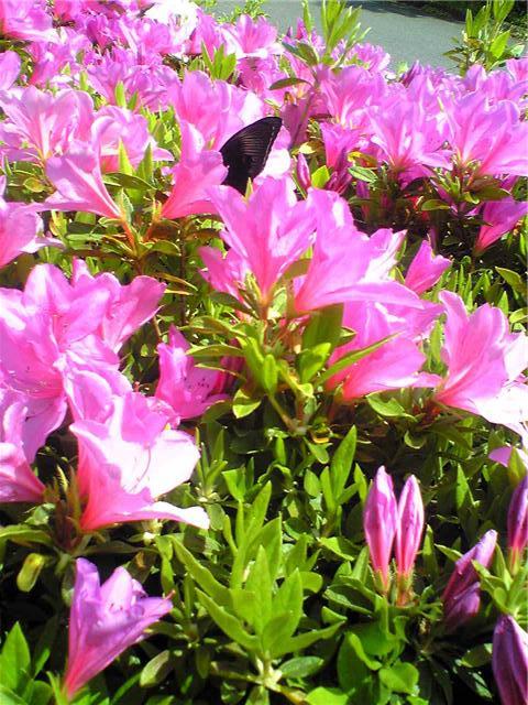 ちょう , ツツジ , カラスアゲハ :カラスアゲハがツツジで蜜を吸っています。もぐりこんでしまってどこにいるかわかりませんでした。春はまだ体が小さくこんな光景もあります。周りではクロアゲハ、カラスアゲハ、モンキアゲハ、ナガサキアゲハ、アオスジアゲハ、アゲハチョウなど大型の蝶が飛んでいます。