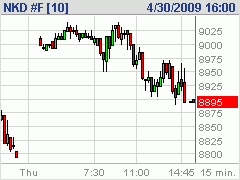 2009/05/01 - aaaいうえおさんの株式ブログ。タイトル:「CME225先物は +35円高の8895 」 本文:CME225先物は +35円高の8895 イブニングのバク上げからは、100円ギャップダウンといった感じです。