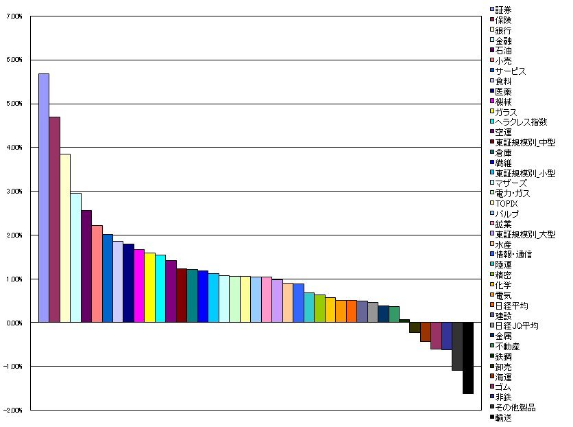 2009/05/08 - tetsuさんの株式ブログ。タイトル:「指数・業種別騰落ランキング 」 本文:1.証券 5.68%(8.76%) 2.保険 4.70%(8.56%) 3.銀行 3.85%(10.51%) 4.金融 2.96%(7.05%) 5.石油 2.56%(4.33%) 6.小売