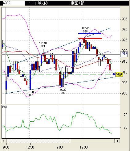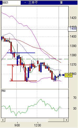 本日の日経は前日終値当たりから始まりローソク足2本目まで上昇後じわじわと下降。9320円付近を切ってきたら売りエントリーしようと思った。8801三井不30分ブレイク1370円@1000で売りエントリー。ロスカットポイントは1383円に設定。目標利益は1354円。6本目で到達。即利益確定。もう少し利益を伸ばしたかったがその後反転上昇。これでよかったと勝手に納得。(損益比率は1:1.2くらい)同時にエントリーしたのが5631日本製鋼これはローソク足3本目でがくんと下げていたので慌てて4本目1195円@1000で売りエントリー。ロスカットポイントは1206円。目標利益は1181円であったがこれはエントリーしなければよかった。1185円までは下げたがその後すぐに上昇。コリャヤバイと思って1202円にて手仕舞い。前場はこれにて終了。+16k-7k=+9k。