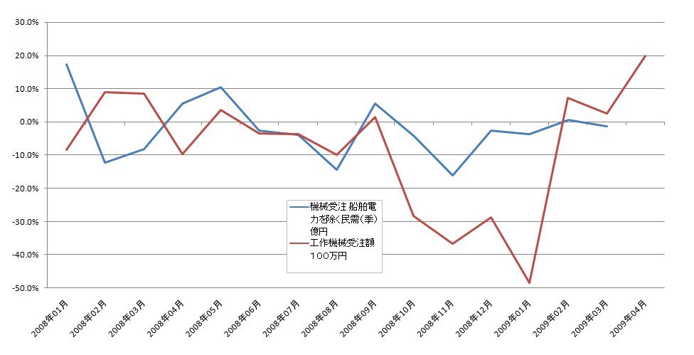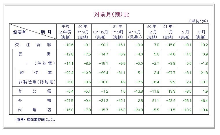 2009/05/15 - tetsuさんの株式ブログ。タイトル:「3月機械受注」 本文:民間設備投資の先行指標である「船舶・電力を除く民需」の動向を見ると、21年2月前月比0.6%増の後、3月は同1.3%減の7,279億円となった。このうち、製造業は同21.8%増の2,567億円、非製造