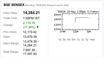 2009/05/19 - 株育男さんの株式ブログ。タイトル:「インド人もビックリ! 」 本文:インド株、総選挙結果好感し急騰 初の取引停止 http://sankei.jp.msn.com/economy/finance/090518/fnc0905181900012-n1.htm