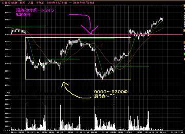 クリック ←^^日経 抵抗、サポートです。ここ3日で、9000~9300は窓埋めしましたが、推移時間が短いため、強い窓埋めとはよびません。ただ、9300はサポートラインとして明日から働く事、上値は抵抗体がないことから、どちらかといえば、上にそんぎり(売り方の買い戻しの力)が一気にかかりそうなイメージをもってます。日足ですが、もみあい時間が長かった事もあり、やはり9000円は強いサポートとして働きます。あとここから上値は抵抗体がないため、上値を追うのも難しくないかなという印象です。ちょっと売り方さんには、恐怖を感じるチャートになってきました^^;たいていの悪材料を織り込んでいる相場ですから、急落が起こりにくい相場です。売り方の人は無理をしないようにして下さい。では帰ります~ クリック ←