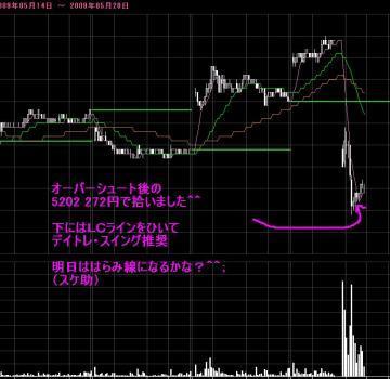 2009/05/20 - aaaいうえおさんの株式ブログ。タイトル:「5202 日本板硝子」 本文:5202 日本板硝子オーバーシュートしましたので、272円で 会員様にひろってもらいました。このまま引ければ、明日ははらみ線になるかなという予想です。下がってきても手法で