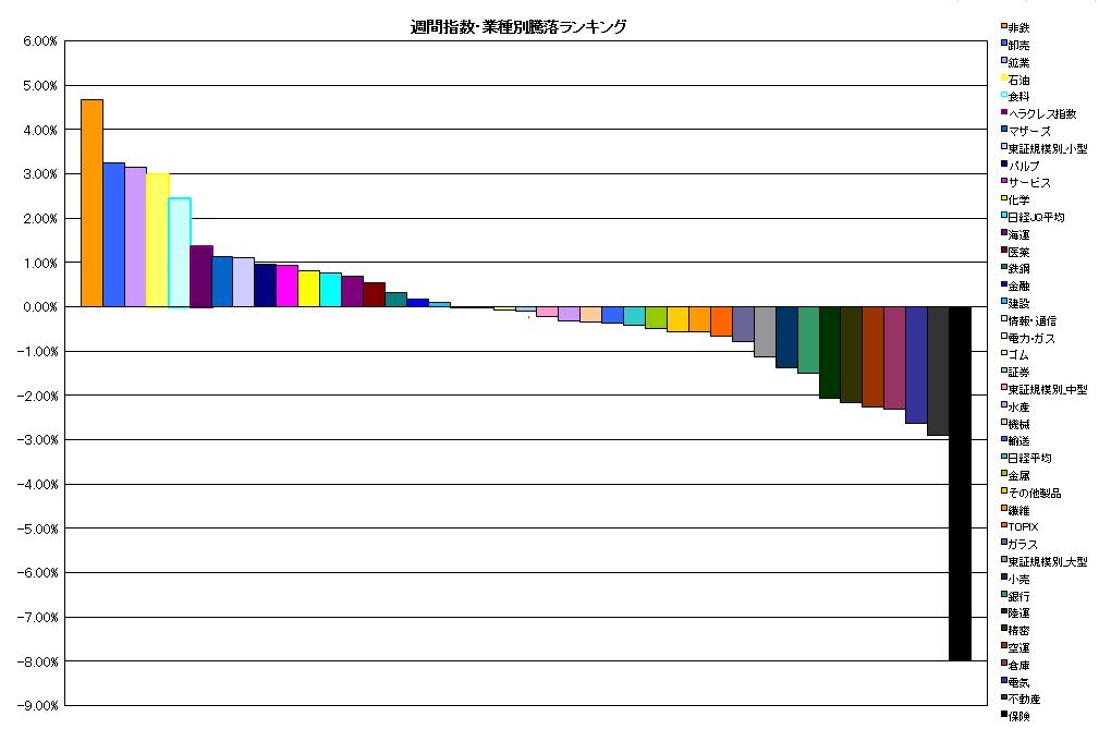 2009/05/22 - tetsuさんの株式ブログ。タイトル:「週間 指数・業種別騰落ランキング」 本文:1.非鉄 4.68%(-3.17%) 2.卸売 3.24%(-0.85%) 3.鉱業 3.14%(-0.24%) 4.石油 3.00%(-0.48%) 5.食料 2.46%(1.92%)