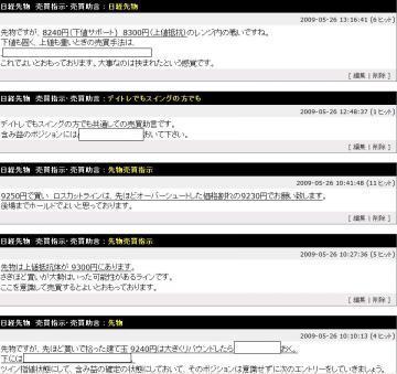 お疲れ様でした~。クリック 本日の日経平均は、下値サポートをぶち破って、下値まで売られたもののまたもやリバウンドの動き。もう下値ががちがちに固められている感覚を受けます。セクタでも、銀行株、海運株、商品市況に連動するセクタなど出遅れも多く、ドル安でハイテク、自動車セクタが売られたとしても、他が支える地合いが続いてます^^; 日経 7000の頃は、9000の位置は高く感じましたが、長く推移しているとこの9000円が安くなってくる。むしろ売るのが怖くなってくる。相場は不思議なものです。会員の方には、日経先物を9300手前で一度ひろってもらいましたが、サポートをわったのでロスカット、下値のサポートを9260円と設定しておりましたので、そのサポートわれでオーバーシュート後、2度ひろってもらってトータルは大きくプラスで終われました。↑ 本日の先物の売買助言です。 後個別は、ネットエイジ 先日寄り買い。本日寄り売り~&後場売り これは分かりやすかった~。明日からも頑張ります。クリック ←現在9位 ><お疲れ様でした~ また夜記事かきます^^ブログを読んでる方は、右上のランキングクリックしてね^^♪