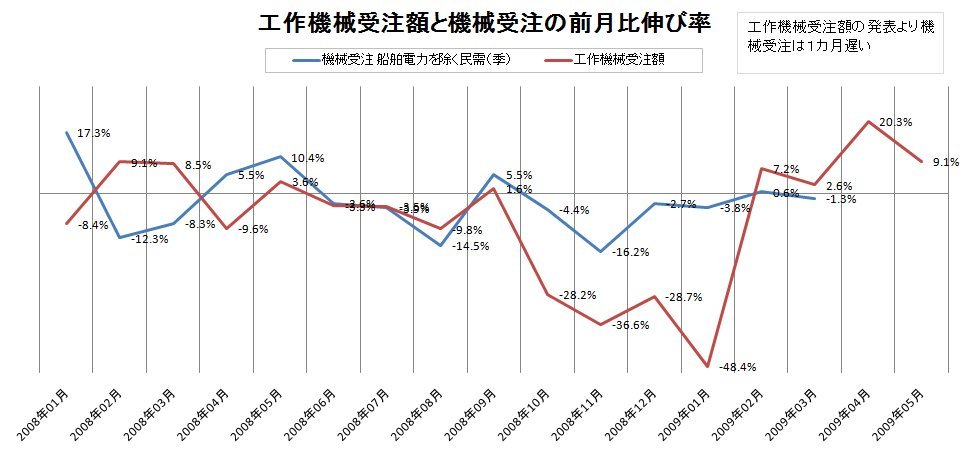 2009/06/10 - tetsuさんの株式ブログ。タイトル:「本日は機械受注の発表が8時50分(グラフ付き)」 本文:昨日発表された工作機械の受注は5月は前月比9.1%増。 しかし機械受注は遅れて4月分の公表なので、 工作機械受注の4月はプラスの20.3%。