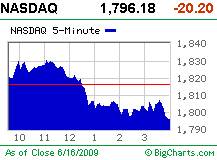 投資家の皆様 お疲れ様です~~~。まずはクリックして下さい^^ ↑が 先日のダウとナスダックのチャートです。ダウ工業株、チャートは→こちら ナスダック、チャートは→こちらドル円、チャートは→こちらSOX指数、チャートは→こちらWTI原油、チャートは→こちら全営業日のダウとナスダックは以下の結果でかえってまいりました。ダウは、続落の展開。ダウ工業株 8504.67(-107.46)、ナスダック、1796.18(- 20.20)、CME日経225先物 9735 (- 35)でかえってきております。先行指標となる住宅着工許可件数も市場予想を上回ったことを受けてプラスではじまったものの、FRB発表の5月の鉱工業生産指数が市場予想を下回った事で、再度下落する展開です。指標はよいわるいでしたから、短期トレンドの力でテクニカル的に下落したと言えます。ダウは、ちょうど8500までの急騰ゾーンを埋めた形で、ここから下はわりと売りずらいのかなという印象をもっております。日経は9500までは下値を押す可能性があると見てます。記事を読んだ方はクリックして下さいm( )m 。