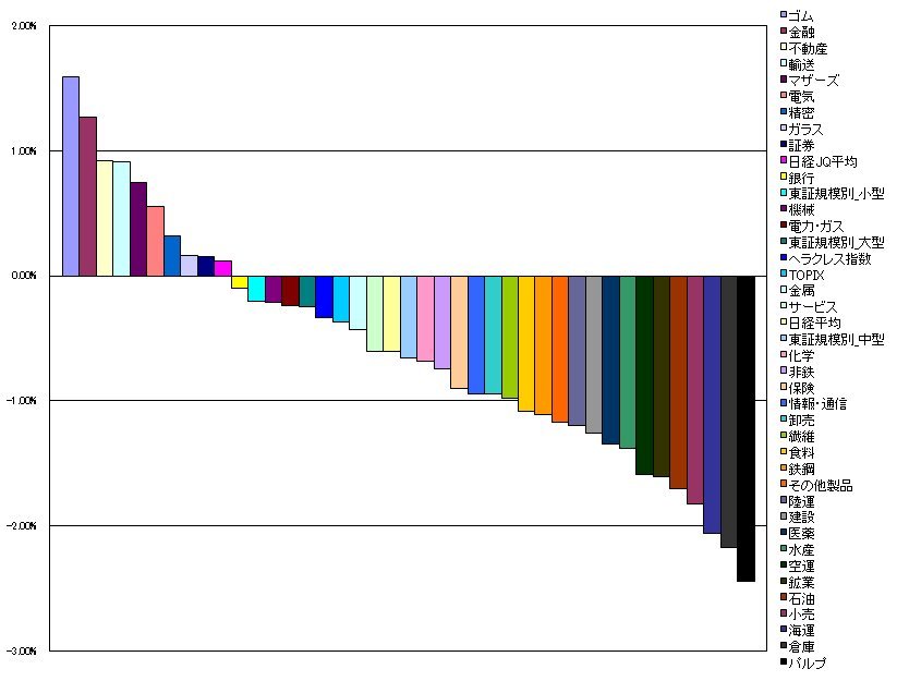 2009/07/03 - tetsuさんの株式ブログ。タイトル:「指数・業種別騰落ランキング」 本文:1.ゴム 1.59%(2.75%) 2.金融 1.27%(-1.25%) 3.不動産 0.92%(-2.26%) 4.輸送 0.91%(-0.50%) 5.マザーズ 0.74%(-0.35%)