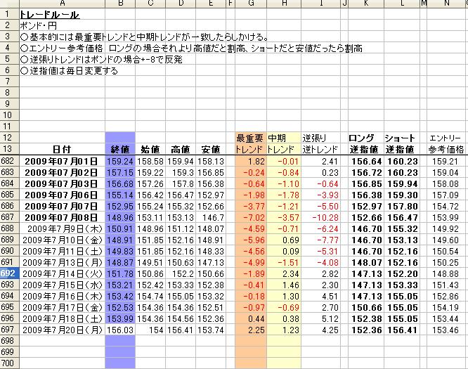 2009/07/20 - レイリーさんの株式ブログ。タイトル:「難しい相場」 本文:ポンド円は難しい相場。 158円を突破できればいいとおもうのだけど。 チャートは+。