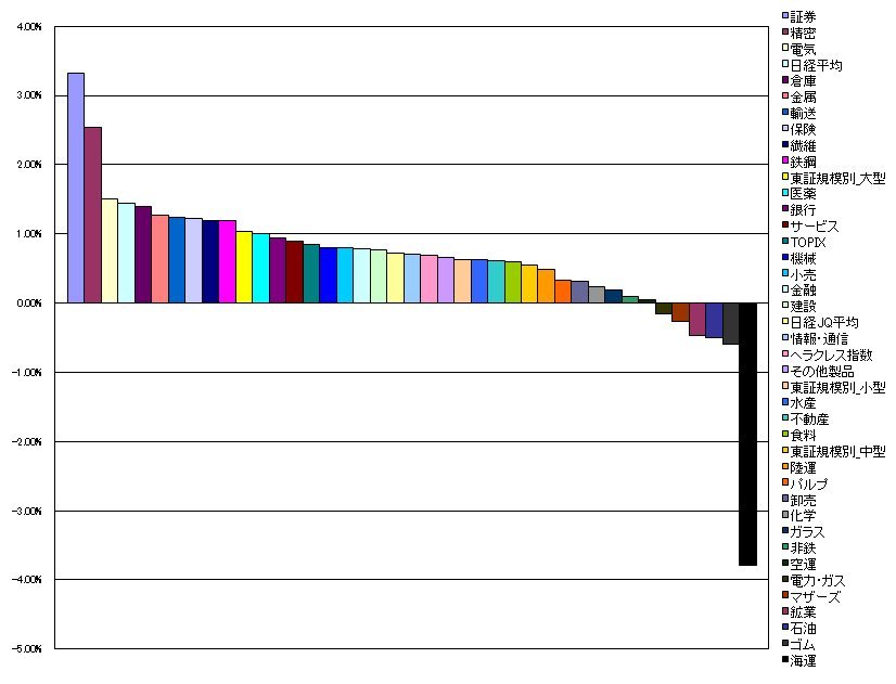 2009/07/27 - tetsuさんの株式ブログ。タイトル:「指数・業種別騰落ランキング」 本文:1.証券 3.33%(1.96%) 2.精密 2.54%(1.77%) 3.電気 1.50%(3.12%) 4.日経平均 1.45%(1.55%) 5.倉庫 1.39%(1.01%)