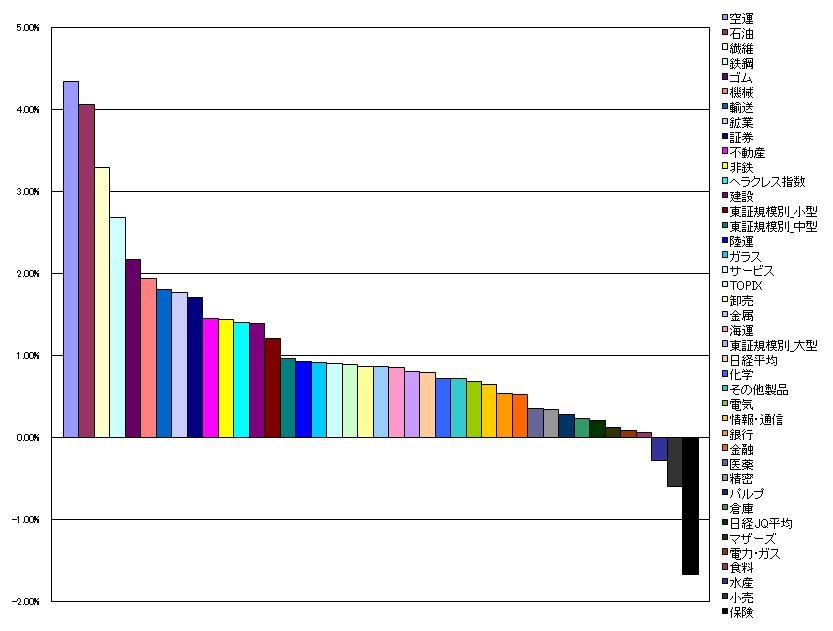 2009/08/13 - tetsuさんの株式ブログ。タイトル:「指数・業種別騰落ランキング」 本文:1.空運 4.33%(-0.24%) 2.石油 4.06%(-2.18%) 3.繊維 3.29%(-0.30%) 4.鉄鋼 2.69%(-1.99%) 5.ゴム 2.17%(-1.80%)