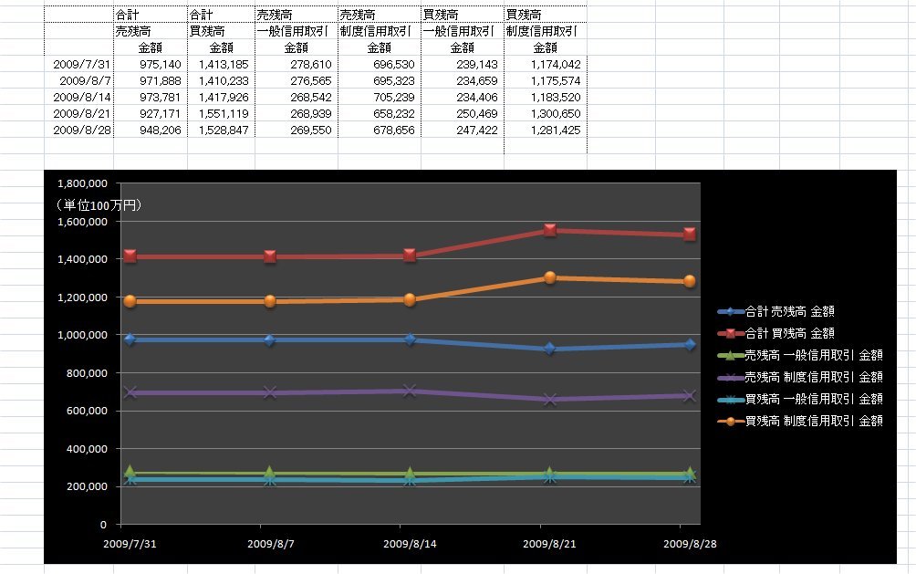 2009/09/01 - tetsuさんの株式ブログ。タイトル:「信用取引現在高(一般信用取引・制度信用取引別)」 本文:東京証券取引所が1日に発表した8月28日申込時点の信用取引の買い残高(東京・大阪・名古屋3市場、制度信用と一般信用の合計)は3週ぶりに減少した。買い残高は前の週(8月21日申し込み時点)に比べ222億